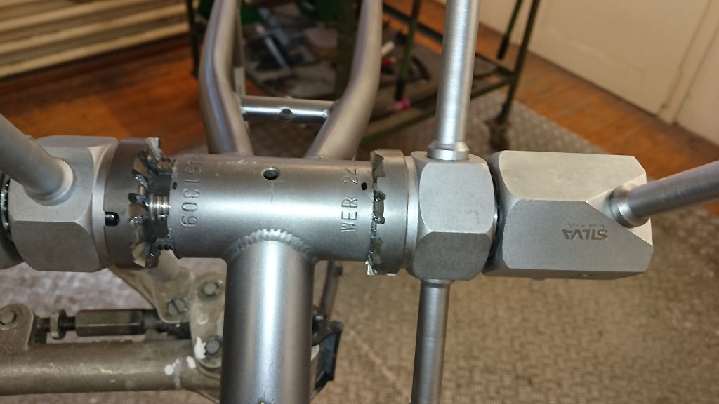 Das Internet teilt mir auf Anfrage mit, dass beidseitiges Abfräsen des Tretlagergehäuses um 2.5mm ein Ding der Unmöglichkeit ist, das gar nicht erst zu versuchen sei. Das ist mir aber (zwangsläufig) egal. Der weiter oben bereits erwähnte Rahmenbauer gewährt mir Zutritt zu seinen heiligen Werkstätten, die ich nach 30 Minuten und 2 x 2.5mm fräsen wieder verlasse; das entspricht 0.00001 km/h und zeigt, dass fräsen und rasen eben nicht das gleiche ist (für die nicht-Schweizer hier: ich glaube, das versteht ihr jetzt nicht ohne weiteres).