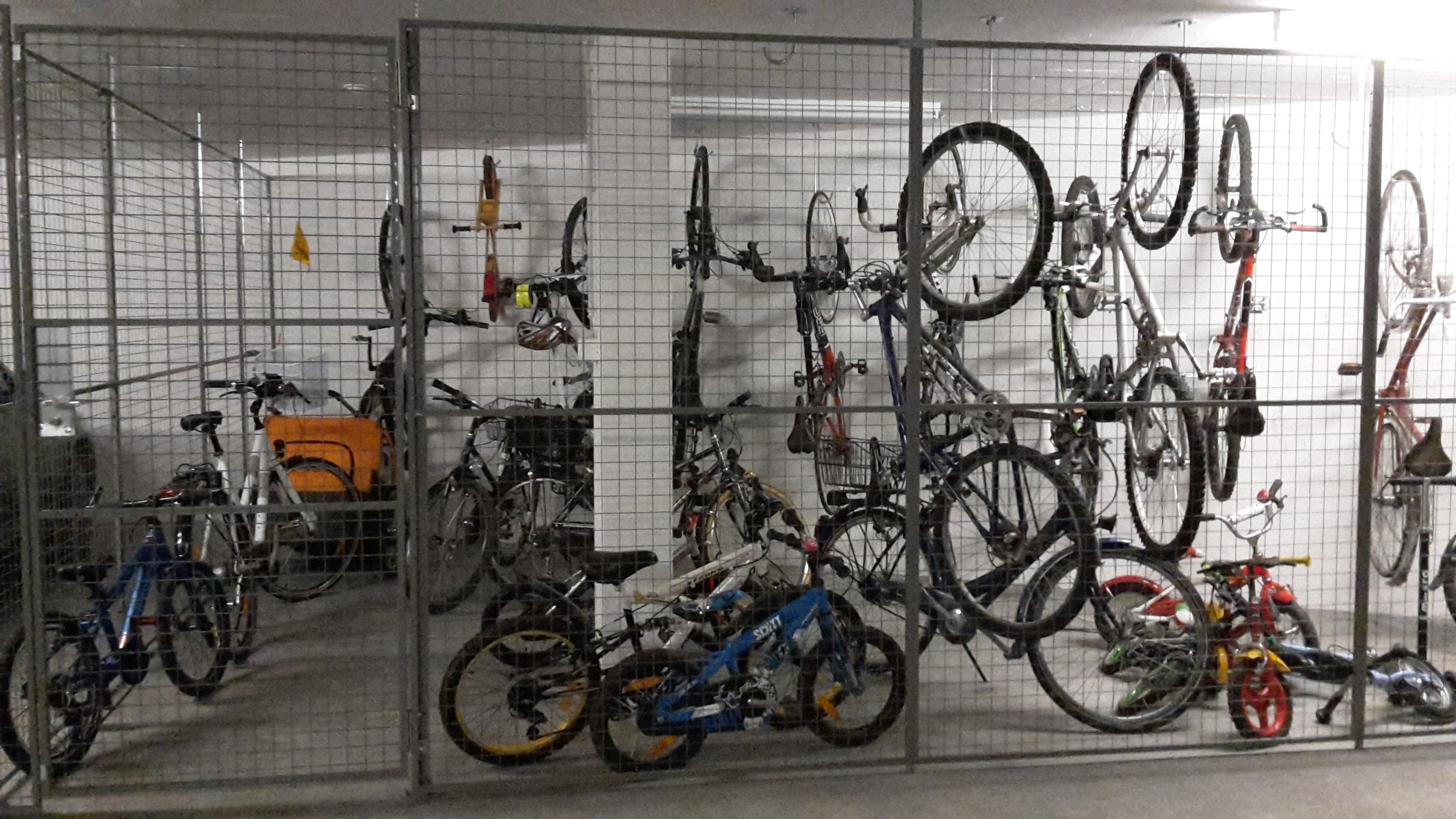 Wenn heute über Tieranwälte diskutiert werden darf, dann sollte man mindestens auch den Begriff der artgerechten Haltung von Fahrrädern einführen. Dieses Bild einer Veloabstellanlage in der Tiefgarage eines Mehrfamilienhauses mag zwar Assoziationen mit Gladiatoren im Kolosseum oder Zobel auf einer Zobelfarm hervorrufen. Man muss sich aber vor Augen halten, dass die Anlage sowas von diebstahlsicher und witterungsgeschützt ist, dass sie fast eine Auszeichnung verdient hätte. Und warm ist es auch, und die Beleuchtung ist einwandfrei, so gut, dass man sogar ein altes Zahlenschloss bedienen kann, auf dessen Zahlen längst alle Farbe abgegriffen ist. Der chaotische Eindruck, den die Anlage macht, rührt von der undisziplinierten Bande von Benutzern. Einziger Wermutstropfen: Für Kinder ist es eine kleine Expedition, ihr Velo aus dem Käfig zu befreien, denn auf dem Weg zum Velo und weiter zum nächsten Trottoir muss man zwei Zylinderschlösser (welches Kind hat schon einen Schlüssel dabei?), eine schwere Gitterschiebetür und wahlweise die schmale, lichtsignalgesteuerte Autorampe, die Treppe oder den Lift überwinden. Also doch nicht artgerecht, denn ein Velo will schliesslich gefahren werden. Mehr zum Thema von allerhöchster Stelle: Hier klicken.