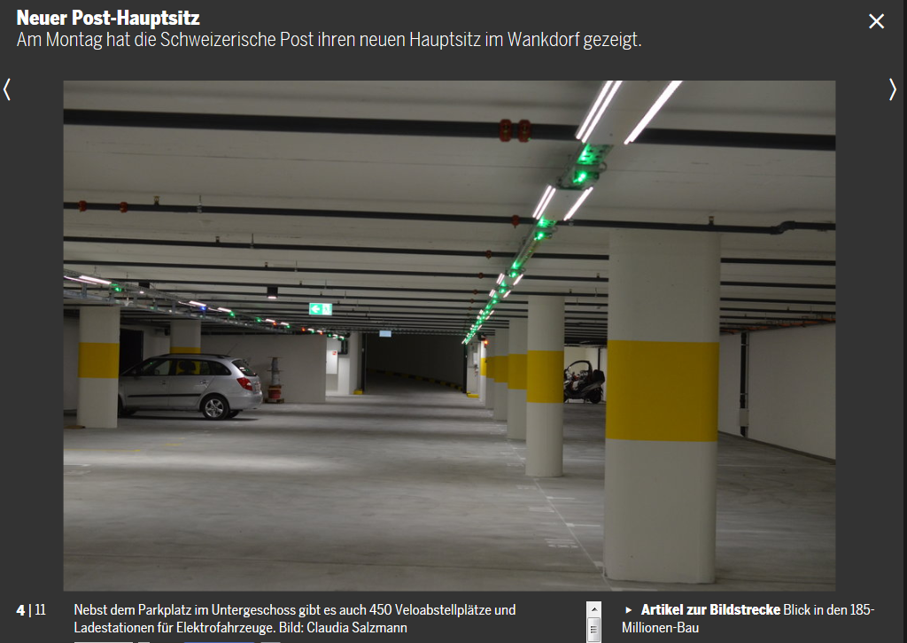 Ob es der Gelbe Riese kann? Dieses Bild soll angeblich aus dem Untergeschoss des neuen Hauptsitzes der Schweizer Post in Bern stammen. Dort (am Hauptsitz, nicht konkret im Untergeschoss) arbeiten in Zukunft 1850 Menschen, und die Veloabstellanlage beherbergt nicht weniger als 450 Fahrräder. Das ist doch mal eine Ansage! Ein Viertel der Belegschaft könnte mit dem Velo zur Arbeit! Ich bezweifle allerdings schwer, dass sich die Anlage jemals füllen wird ohne flankierende Massnahmen, die das Velofahren zur Arbeit attraktiv machen: monetäre Anreize, Garderoben, Duschen, Schränke, seriöse Parkplatz-Bewirtschaftung und aggressives Marketing. Aber ein Anfang ist gemacht.