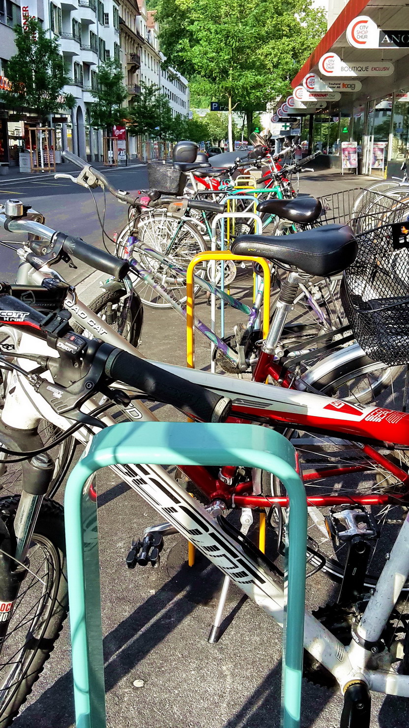 Und das ging so: An dieser Stelle wurde voretwas über einem Monat gezeigt, was für unsäglich unbrauchbare Veloständer in der Stadt Chur im Osten der Schweiz das Stadtbild verschandeln. Spiralständer nämlich, welche jeder Bremsscheibe den Garaus machen und Speichen verbiegen wie Uri Geller einst Löffel – nur weniger subtil. Die Stadtoberen oder ihre Tiefbaubüttel, nicht faul und Kritik gegenüber keineswegs verschlossen, haben nun den Ball aufgenommen und bei der Sanierung des zentral gelegenen Alexanderplatzes bunt plastifizierte Anlehnbügel aufgestellt: