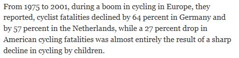 In den USA gingen die Unfälle mit Todesfolgen für einen beteiligten Velofahrer zwischen 1975 und 2001 also weniger stark zurück als in Deutschland oder den Niederlanden – das war aufgrund vieler spezieller Umstände zu erwarten. Aber dass die Zahl überhaupt sank, ist offenbar dem Umstand zu verdanken, dass weniger Kinder auf dem Fahrrad unterwegs sind. Was für eine Art von Unfallprävention?