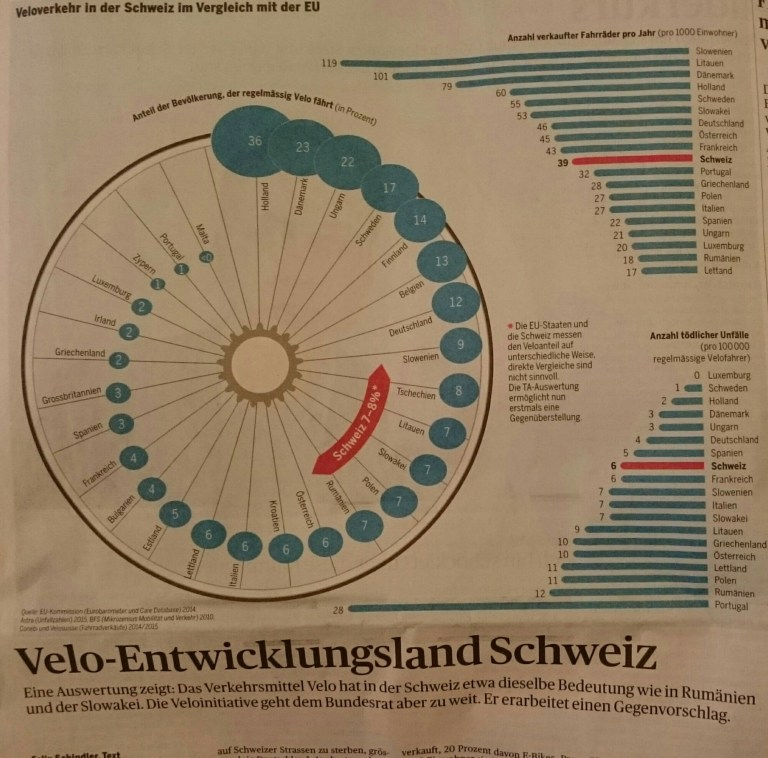 Die Schweizer fahren Velo wie die Leute in Rumänien oder Litauen. Sogar Deutschland ist „besser“ als die Schweiz. Steht alles heute in der Zeitung.