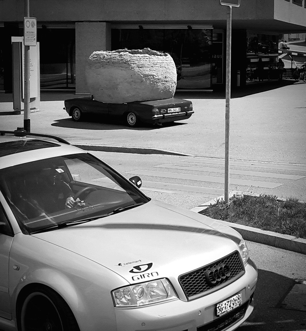 Ich schwöre: Ich kenne den Eigentümer des Personenwagens im Vordergrund nicht, noch habe ich einen Wildfremden gebeten, mit seiner Karre vor meinem Handy herum zu kurven. Tatsache ist, dass ich dieses Kunstwerk, diese Plastik, diese Installation rein zufällig entdeckt habe und fotografieren wollte. Vielleicht hatte ich an dem Tag eine unangenehme Begegnung mit einem Automobilisten gehabt (gut möglich), oder ich war gerade stinksauer auf etwas oder jemanden (noch güter möglich). Jedenfalls hat sie mich angesprochen, diese Skulptur, und deswegen habe ich sie fotografiert.