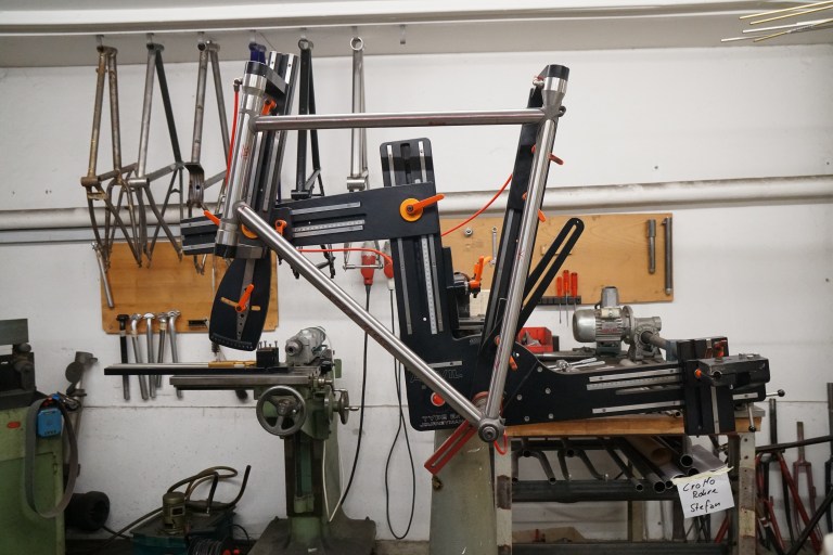 Heute war dann eben Tag Eins. Nach einer kurzen Einführung ins Hartlöten und einer Lektion zur Rahmengeometrie habe ich das Skelett meiner neuen Tante im Massstab 1:1 auf ein grosses Papier gezeichnet. Dann habe ich die Knochen aus der Schachtel genommen und auf die Zeichnung gelegt. Ich habe sie markiert, gefräst, geschliffen, zusammengehalten, wieder auf die Zeichnung gelegt, wieder gefräst, die Zeichung korrigiert, Rohre gefräst, in die Muffen zusammengesteckt, wieder auseinandergenommen, in die Rahmenlehre eingespannt, wieder in die Fräse gespannt, und so weiter. Irgendwann war Abend, und Tag Eins am Ende.