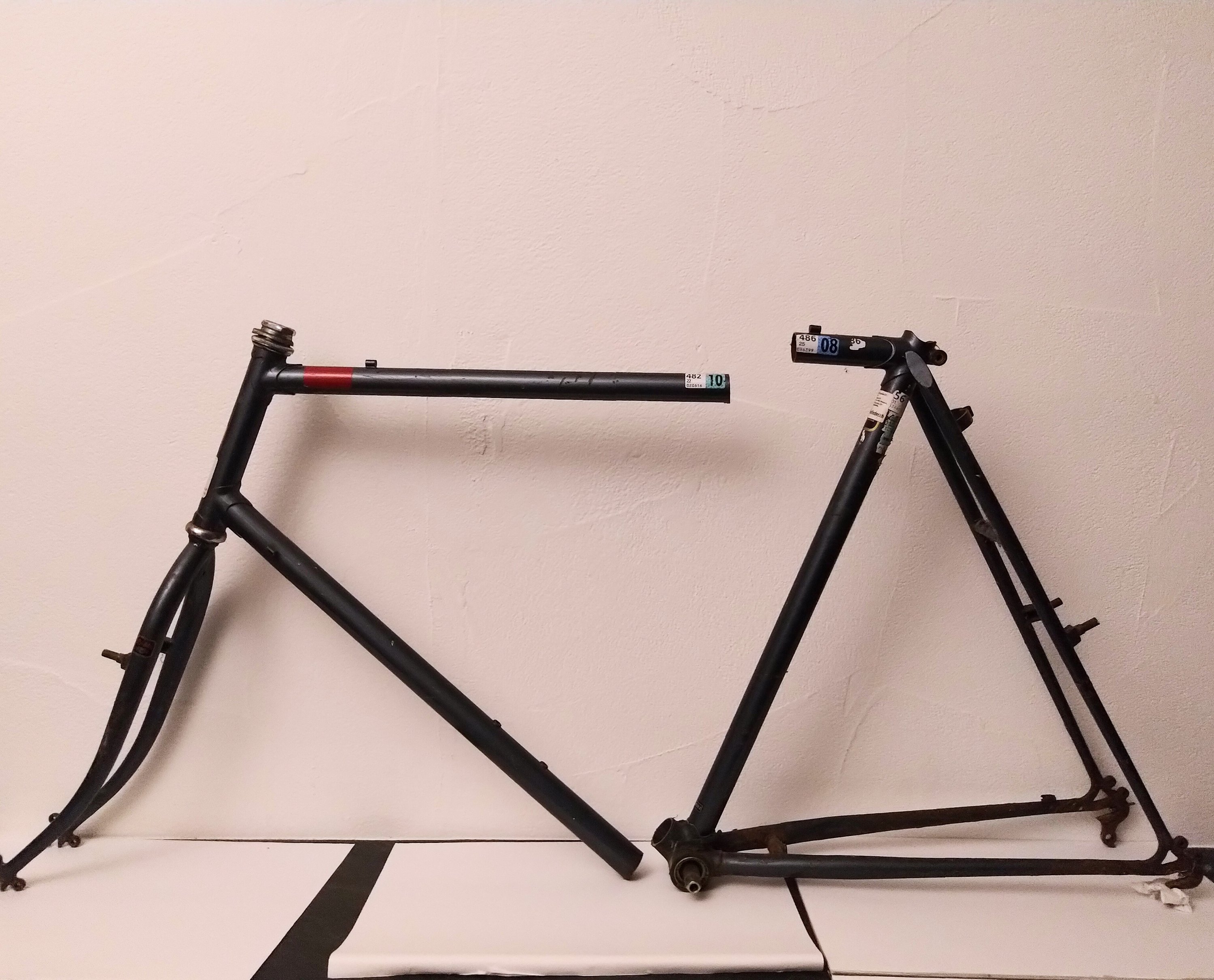 - Für den Innengebrauch: Auflagepunkte am Tretlager und an den Ausfallenden abdecken, um Schäden am Parkett und damit an der Beziehung zu den Mitbewohner*innen zu vermeiden. Hier kamen Reste eines alten Reifens zum Einsatz und selbstverständlich Kabelbinder! Stricken ginge wohl auch, Filz, oder, ebenfalls stimmig, Lenkerband oder Fahrradschlauch.