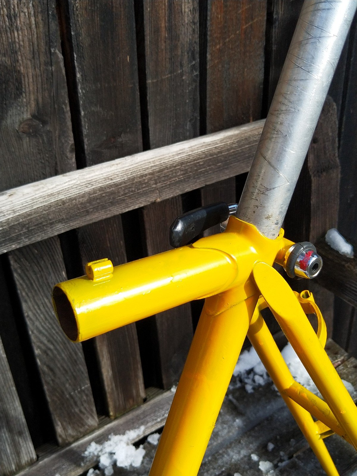- Rahmen zersägen. Wer keinen hinter dem Haus findet, geht zum Werkhof und steigt in die Sperrgutmulde. Man glaubt gar nicht, was da alles drinsteckt! Ich habe das Unterrohr am Tretlagergehäuse abgeschnitten, das Oberrohr aber zehn Zentimeter vor dem Sattelrohr. So blieb die Muffe erhalten, und der Stummel kann zum Tragen benutzt werden (siehe Bilder weiter unten). Eine gewöhnliche Handsäge für Metall reicht gut aus, eine Flex benutzt nur der fortgeschrittenen Heimwerker, der ihre Anschaffung irgendwie rechtfertigen müssen (Carbonrahmen nur mit den entsprechenden Arbeitsschutz-Massnahmen zersägen.)