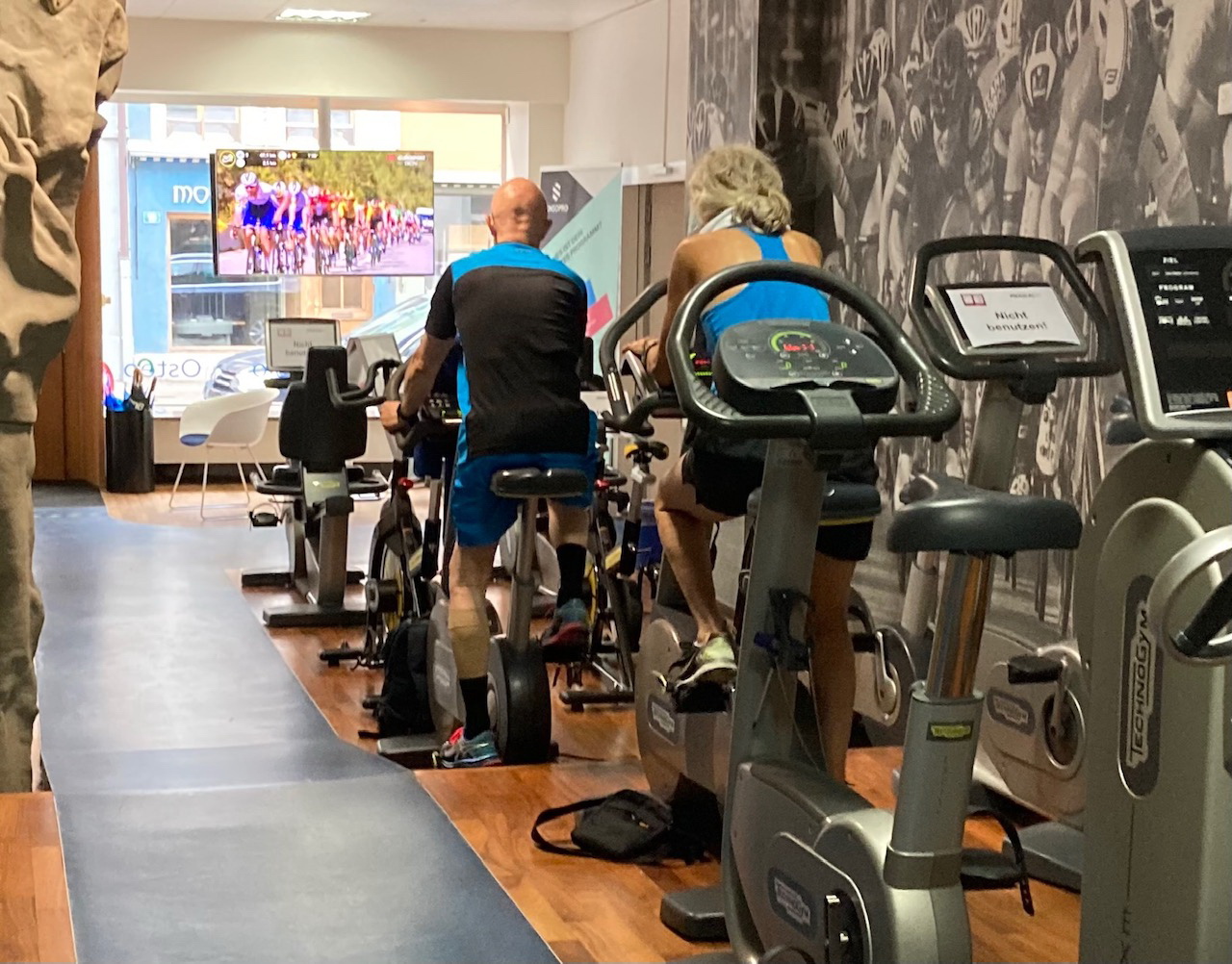 Bis heute verbringe ich jeden Winter rund zwanzig Stunden auf der Rolle und schaue dazu fern (am liebsten Sachen aus der arte-Mediathek, die leider völlig zu Unrecht als elitär oder versnobt verschrien ist). Ich mache also auf den ersten Blick dasselbe wie die beiden auf dem Bild. Und doch kann ich nicht anders, als die Szene oben mit „entartet“ zu beschreiben. Eine feine Linie, gewiss. Ich versuche zu erklären.