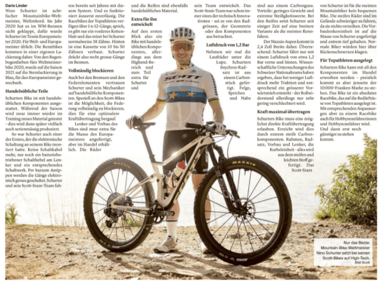 Letztes Wochenende gab es eine neue Variante. E-Mobilität war nicht das Thema. Verfasst worden war der Text vom oder für den Sportvelo-Hersteller Scott. Die Geschichte war die: Der Schweizer Über-Mountainbiker Nino Schurter benutzt, um die gesamte Konkurrenz regelmässig in Grund und Boden zu fahren, kein spezielles Bike. Es hat lauter Teile dran, die man in jedem Veloladen kriegt, also handelsübliches Zeugs. Die Sachen wurden zwar für Schurter und seine Teamkollegen entwickelt und stammen aus dem High-End-Bereich (sprich Höchstpreis-Segment), sind aber dennoch handelsüblich.