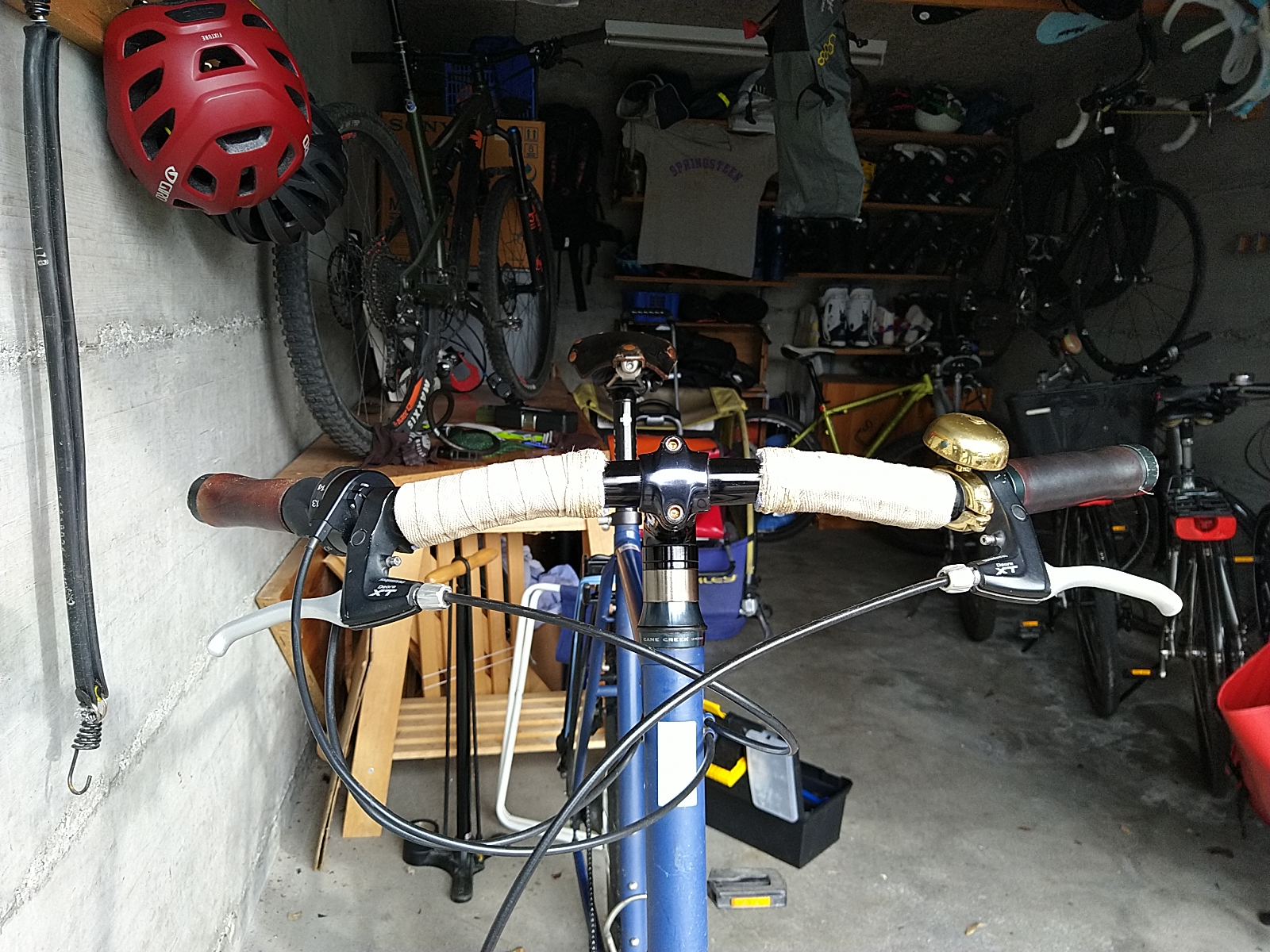 In den Newsletters von Rivendell wird immer wieder berichtet, wie einer ihrer Angestellten lange genutztes Velo mit neuen Rädern, neuem Gepäckträger, neuem Lenker versieht oder es anderswie umbaut. Das macht Lust, es selber auszuprobieren, besonders wenn man täglich mit dem Velo kilometerweise zur Arbeit fährt. Da hat man nämlich gern einmal ein wenig Abwechslung. Besonders nahe liegend sind Anpassungen am Lenker. Die sind nicht aufwendig, aber sehr effektiv, denn auf dem Lenker starrt man ja meistens drauf, weil es als einziges wesentliches Teil des Velos ständig im Sichtfeld der fahrenden Person ist. Und man hat ihn wie erwähnt stets in den Händen. Auch ein Lenker hat, wie jedes Ding, zwei Seiten, nämlich oben und unten. Er lässt sich also auf den Kopf stellen. Und wenn man schon dabei ist, lohnt es sich, an den Griffen gleich auch was zu machen, und seien es nur die in der Mitte des Lenkers: