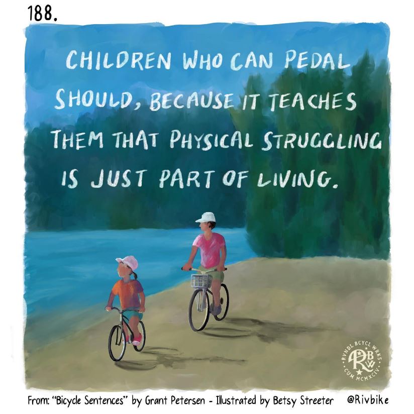 Der eine ist Rivendell Bicycle Works, die Stahlrahmenschmiede aus Kalifornien. Auf Instagram (@rivbike) schreibt der Firmengründer Grant Petersen immer wieder kurze bicycle sentences. Das sind Weisheiten zum Velo und zum Velofahren, manchmal kommen sie etwas oberlehrerhaft daher, meistens sind sie aufschlussreich und regen zum Denken an. Am 9.3.2023 stand da: