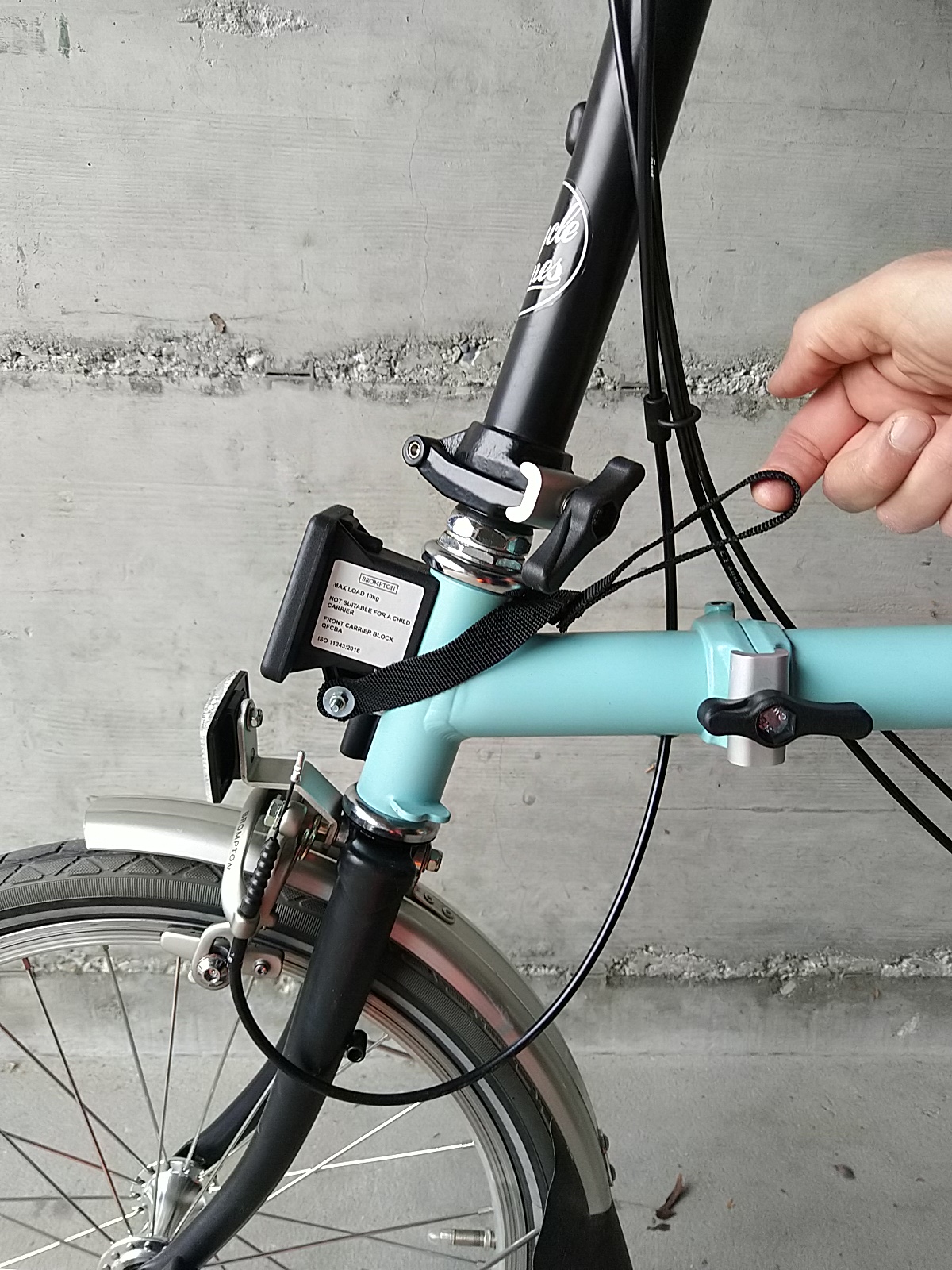 Eine knappe Stunde später ruht der Drehmomentschlüssel wieder in seiner Schatulle. Alle Velos sind nun korrekt verschraubt. Die Arbeit geht aber keineswegs aus: Irgendwo taucht in irgendeiner Schachtel ein Stück Feder auf, das sich hervorragend eignet, um die Schraubverschlüsse am Brompton-Faltvelo zu optimieren. Das klappt nach bloss drei Versuchen und einem Wechsel der Feder (die nämlich einen kleineren Durchmesser hatte als die Schraube, die sie hätte federn sollen). Und wo es schon mal aufgefaltet ist, das Faltvelo: da war doch noch der clevere Bandmechanismus aus dem Internet, mit dem die Fronttasche leichter aus ihrer Halterung gelöst werden kann – das lässt sich doch bestimmt auch selber machen herstellen! Zwar ist die dazu notwendige Lochzange nicht mehr, was sie mal gewesen sein dürfte, aber Irgendwann ist das Band montiert:
