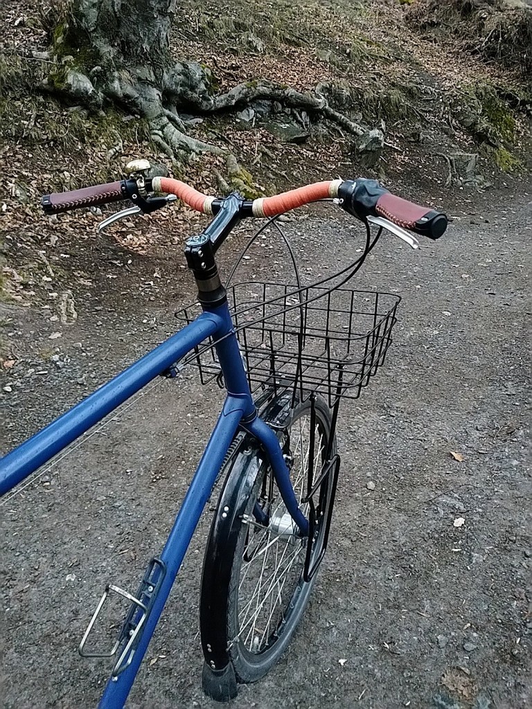 Glücklicherweise standen wenig später auch gleich die Osterfeiertage in unserem Heim, und zwar teilweise verregnet, so dass ich gleich Zeit für den Einbau fand. Nun bin ich beim Schrauben leider talentfreie Zone. Und den Gemeinplatz, dass Übung den Meister macht, habe ich sowas von widerlegt. Aber die Leute bei Pelago in Finnland, die mir die Teile verkauft haben, haben ganze Arbeit geleistet und eine gut verständliche Montageanleitung im Posterformat beigelegt. (Dreht man sie um, ist sie tatsächlich ein Poster.) Damit wurde selbst ich in die Lage versetzt, den Korb über dem Vorderrad anzubringen. Dank der praktischen Ahead-Vorbauten, bei denen man den Lenker beim Wechseln nicht durch die Klemme zu ziehen braucht, ist so ein Lenkerwechsel auch ein Kinderspiel, und so blieb nur noch die Verkabelung des Scheinwerfers, der künftig am Korb statt am Gabelkopf sitzen wird. Beim Gedanken daran wurde mir schon ganz anders. Ich lenkte mich ab, indem ich meine letzte Rolle Newbaum’s-Baumwoll-Lenkerband an meinen neuen Lenker band, samt Hanfschnur-Abschluss ohne Knoten. Danach machte ich eine Probefahrt und konnte feststellen: Das ist zwar noch mein altes Fahrrad, sieht aber nicht mehr so aus und fährt sich auch ganz anders. Mission erfüllt!