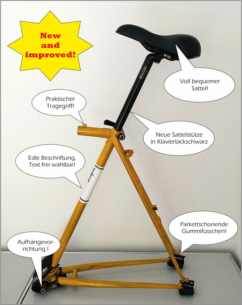 Grossartiger Vorschlag! Das entwickelt sich langsam zu einer Geschäftsidee! Ich denke da auch an einen Sattellift für die Benutzung an höhenverstellbaren Tischen, einen Bidonhalter am Sattelrohr für den Thermosbecher Kaffee oder eine Satteltasche für persönliche Utensilien wie Kamm, Lippenstift oder Raucherwaren. Hat Potenzial!