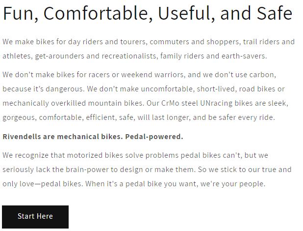 Wenn man sich die – natürlich auf Film aufgenommenen – Schwarzweissfotos der Velos im Einsatz auf der Website von Rivendell Bicycles anschaut, kriegt man aber ganz viel venustas zu sehen. Firmitas und utilitas en masse, und die Räder dienen ihrem Zweck ganz bestimmt. Aber lesen Sie doch gleich selbst, wie Rivendell seine Produktpalette umschreibt: