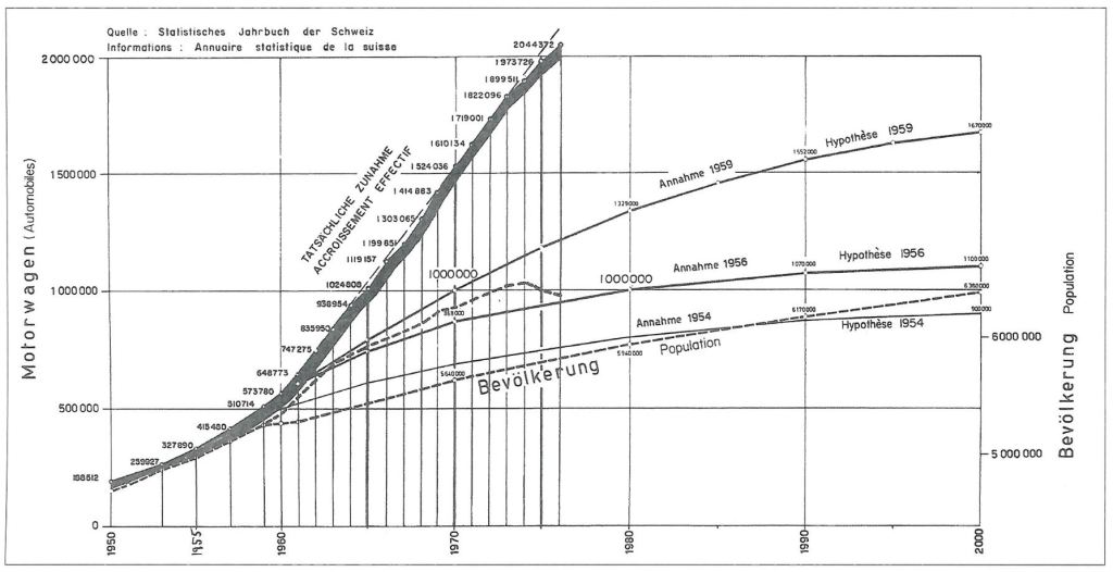 Zum Schluss noch eine Trouvaille: Eine Grafik aus der Mitte der Siebzigerjahre zur die Entwicklung des Autoverkehrs in der Schweiz in den Fünzigern. Die schmalen ausgezogenen Linien sind die Prognosen von 1954, 1956 und 1959. Die dicke Linie ist die tatsächliche Entwicklung. Die Grafik zeigt schön, wie kurz nach dem Beginn des Baus von Autobahnen (1955) die Anzahl zugelassener Motorfahrzeug durch die Decke ging und auch die laufend nach oben angepassten Prognosen blöd hinstellte. Wollen wir aus der Geschichte auch mal etwas lernen?