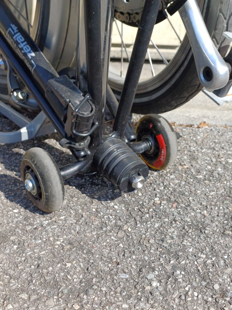 Ich, nicht faul, krempelte die Ärmel hoch und begann aufzuräumen, zu pumpen, zu waschen und wegzuschmeissen. Dann wollte ich kreativ werden und ersetzte endlich die serienmässig schlechten Rollen am Brompton-Faltrad durch alte Inlineskate-Rollen (Anleitung dazu hier). Dazu musste ich sogar zum ersten Mal in meinem Leben ein Gewinde schneiden, was halbwegs gut gelang. Aber eben nur halbwegs und nicht ganzwegs, darum beschreibt das Velo nun eine recht enge Kurve, wenn ich es im halbgefalteten Zustand geradeaus hinter mir her ziehen will. Unangenehmer Nebeneffekt: Ich darf es nicht loslassen, falls der Untergrund nicht auf das Promille genau eben ist, sonst rollt es ohne Voranmeldung davon.