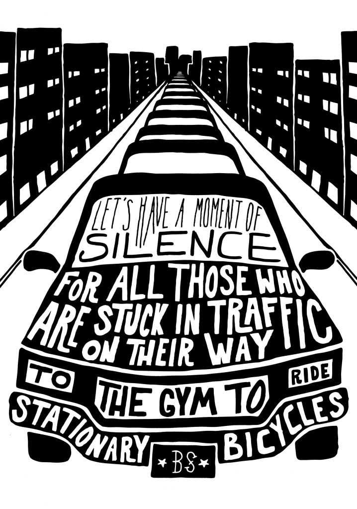 Die Absurdität unseres Bewegungsverhaltens wird auf den Punkt gebracht in einer Abbildung des Magazins Boneshaker, das es leider nicht mehr gibt:
