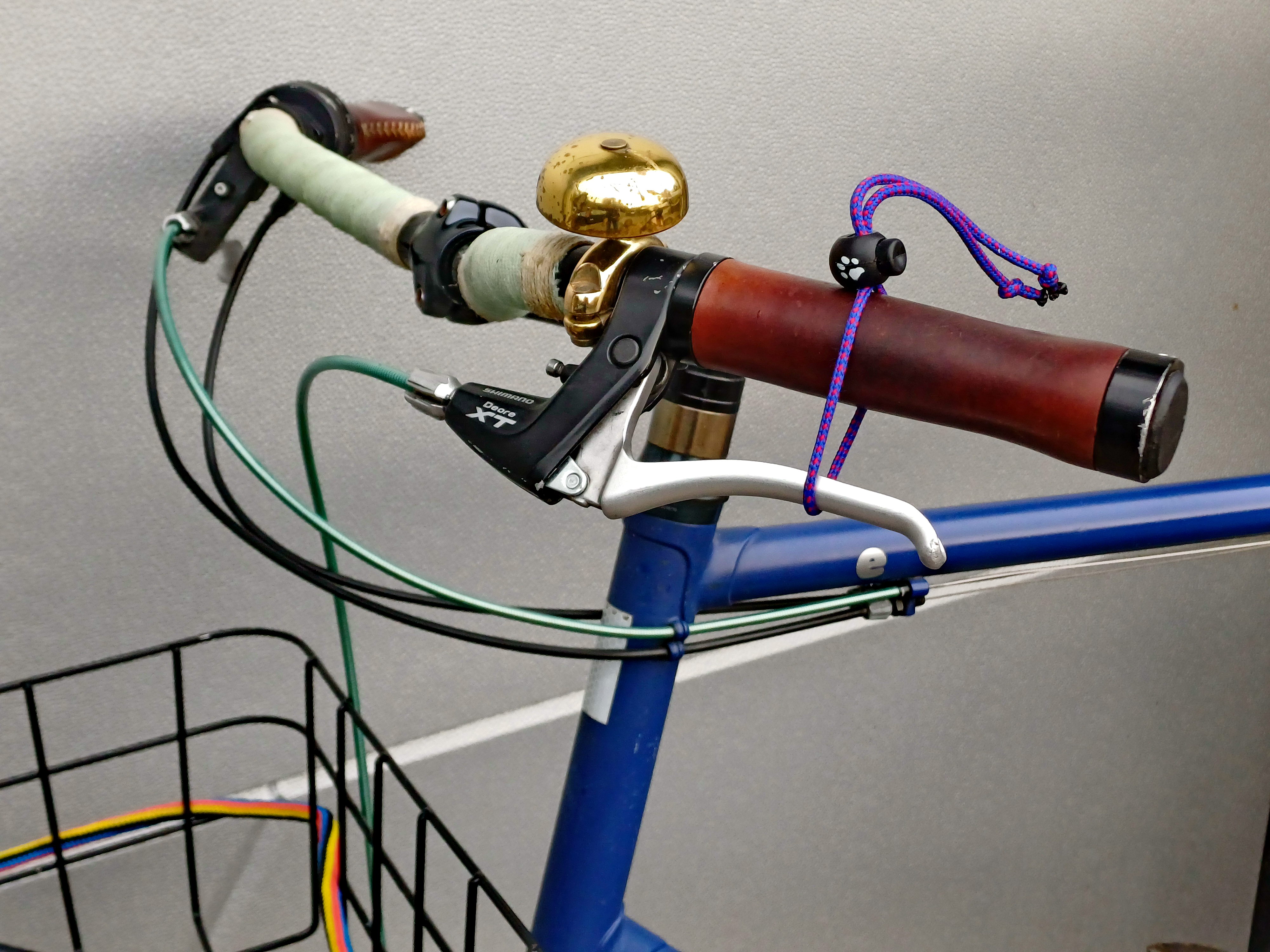 Genug gegeifert. Etwas Erfreuliches zum Schluss: Es gibt auch sinnvolle Verbesserungen am Fahrrad, und die sind oft, wie das Fahrrad selbst, schlichter Natur. Ein Spritzschutz zur Verlängerung eines zu kurz geratenen Schutzblechs zum Beispiel, und warum nicht gefertigt aus einer zu klein gewordenen Smartphone-Hülle, die ihrerseits mal eine Lastwagenplane war. Quasi Recycling im Quadrat. Ein anderes Beispiel: Die Handbremse. Ein schwer beladenes Velo oder eins mit einem Hinterradständer steht oft instabil. Besonders, wenn der Boden ganz leicht geneigt ist. Muss ein Velo an eine Wand gelehnt werden, rollt es meist weg, kippt dann um und kriegt Kratzer ab. Helfen tut ein Stück Schnur mit einem Kordelstopper (das Teil muss doch so heissen, oder nicht?), mit der ein Bremshebel an den Lenker gebunden wird. Während der Fahrt baumelt die Handbremse dann einfach am Lenker. Leichter als fünf Gramm, nicht im Handel, aber das Material liegt im gut sortierten Haushalt in der Allerlei-Schublade. Funktioniert bestens und sieht so aus: