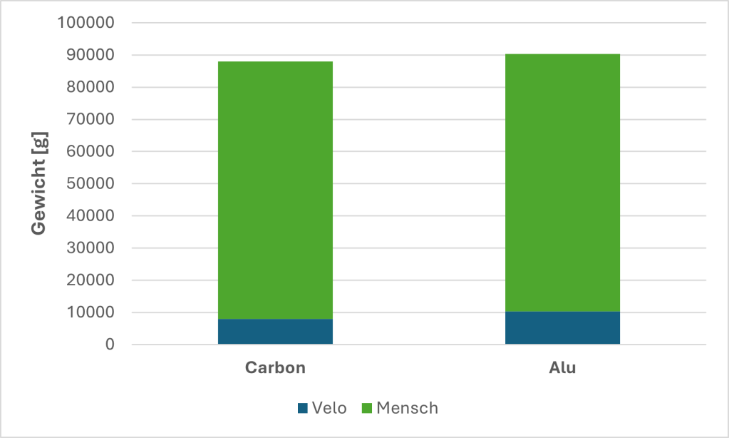 Je länger ich nachdenke, desto mehr Missverständnisse im Kontext des Fahrrads fallen mir ein. Zum Beispiel: Die Gewichtsdiskussion. So faszinierend die Möglichkeiten zur Reduktion des Gewichts eines Velosattels oder einer Speiche sind: da wird bloss mit viel Geld das Systemgewicht (also Mensch plus Maschine) um wenige Gramm reduziert. Zur Erläuterung ein Rechenbeispiel: Kommt ein achtzig Kilo schwerer Mann in einen Veloladen und kauft sich ein Carbon-Rennrad mit einem Gesamtgewicht von 7’580 Gramm. Sein Systemgewicht: 87.580 kg. Wenig später kommt ein anderer, ebenfalls achtzig Kilo schwerer Mann in den Laden und kauft dasselbe Modell von Rennrad in derselben Grösse, aber mit einem Alu-Rahmen von 9’840 Gramm. Sein Systemgewicht: 89.840 kg. Gehen sie zusammen auf eine Ausfahrt und machen ein Rennen, ist der Carbon-Pilot krass im Vorteil, wie nachstehende Grafik eindrücklich zeigt (oder auch nicht):